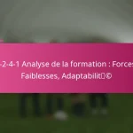 La formation de football 3-2-4-1 est un dispositif tactique qui équilibre de fortes capacités offensives avec une structure défensive solide, comprenant trois défenseurs, deux milieux de terrain centraux, quatre milieux de terrain offensifs et un attaquant. Cette formation met l'accent sur le contrôle du ballon et le jeu offensif, permettant aux équipes de maintenir la possession tout en s'adaptant à diverses situations de match. Cependant, elle présente également des défis, tels que la vulnérabilité aux contre-attaques et la dépendance à la condition physique des joueurs.
